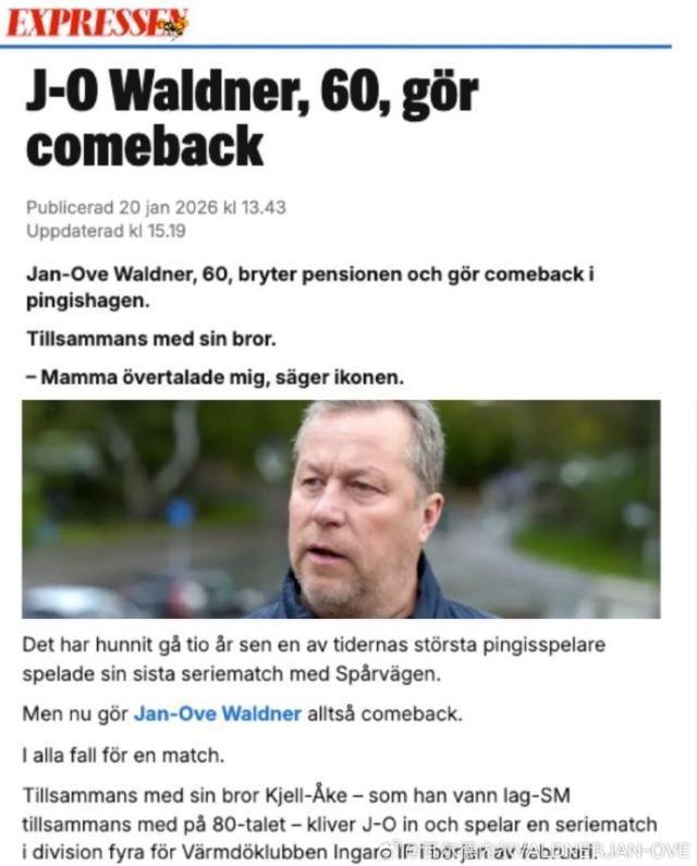 1月21日讯 60岁的瑞典乒乓球名将瓦尔德内尔宣布,自己将复出回到赛场,他将参加瑞典丁级联赛(第四级别)英加略对阵布奥的比赛,代表英加略俱乐部出战。谈到本次复出的原因,瓦尔德内尔写道:妈妈想再看到我们兄弟俩一起打球,我们兄弟俩都很愉快地同意了。被问到是否还能征战瑞典乒乓球顶级联赛,老瓦回答:“顶级联赛的难度大多了,球速快、节奏紧,不仅需要出色的体能,还得打大量的比赛保持状态。如果要打顶级联赛,我得先减掉六七公斤体重,把体能练上去才行,但我现在实在吃不消这些。”