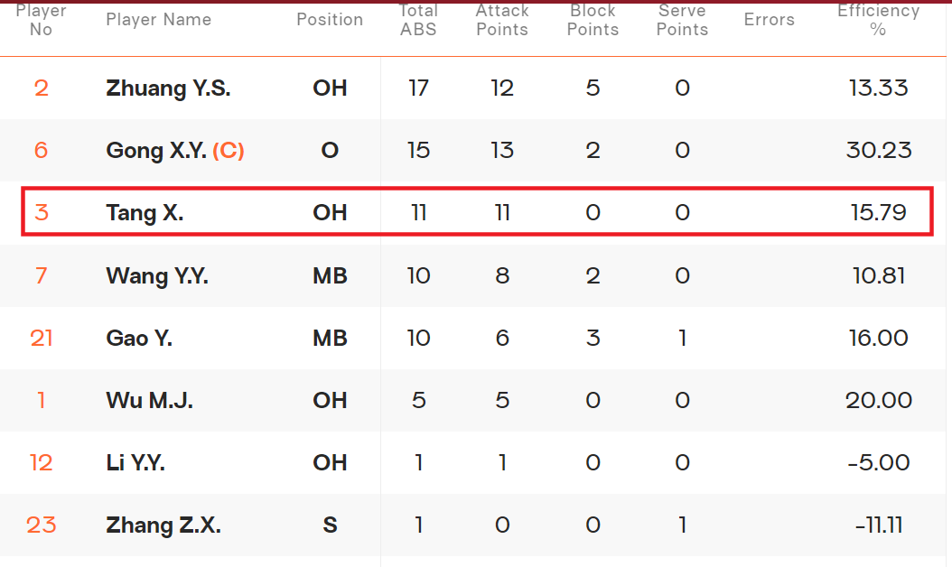 这一战,庄宇珊再次得到全队最高分,贡献了17分,其中拦网得到5分。龚翔宇也有稳定的表现,得到15分。王媛媛和高意都得到10分。这一战,中国女排的副攻表现提升了。但是在主攻位置出现了一些问题。