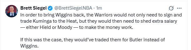 Brett Siegel还表示,如果真需要如此复杂的操作,他们本应该在上赛季就直接用这些资源换得巴特勒,而不是现在反过来再去追求旧将维金斯。